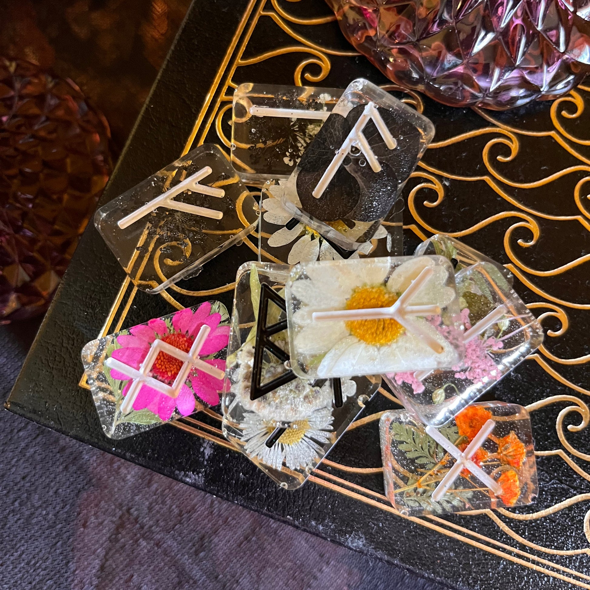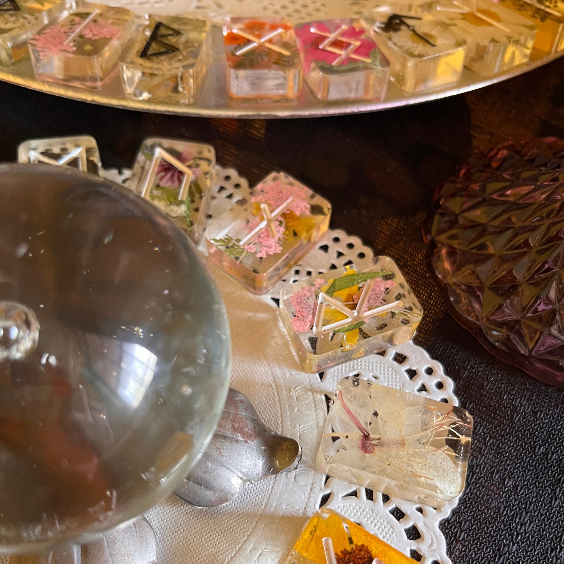 Beautiful multi-colored pressed flowers in resin.
