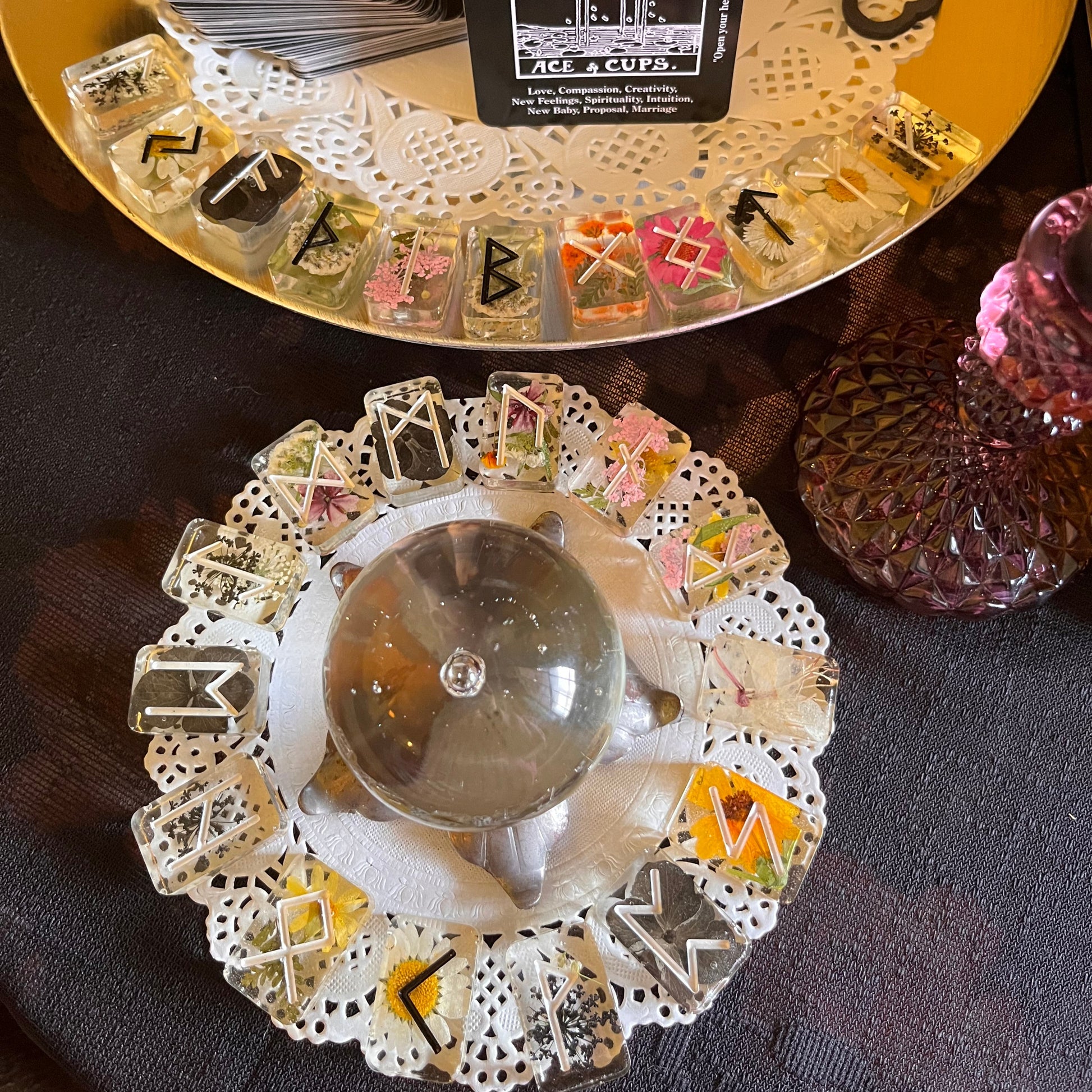 Beautiful, Full Set of Futhark Runes, including one blank. This set of Runes features hand frosted edges and hand painted letters. These Runes can be used for divination if you wish.